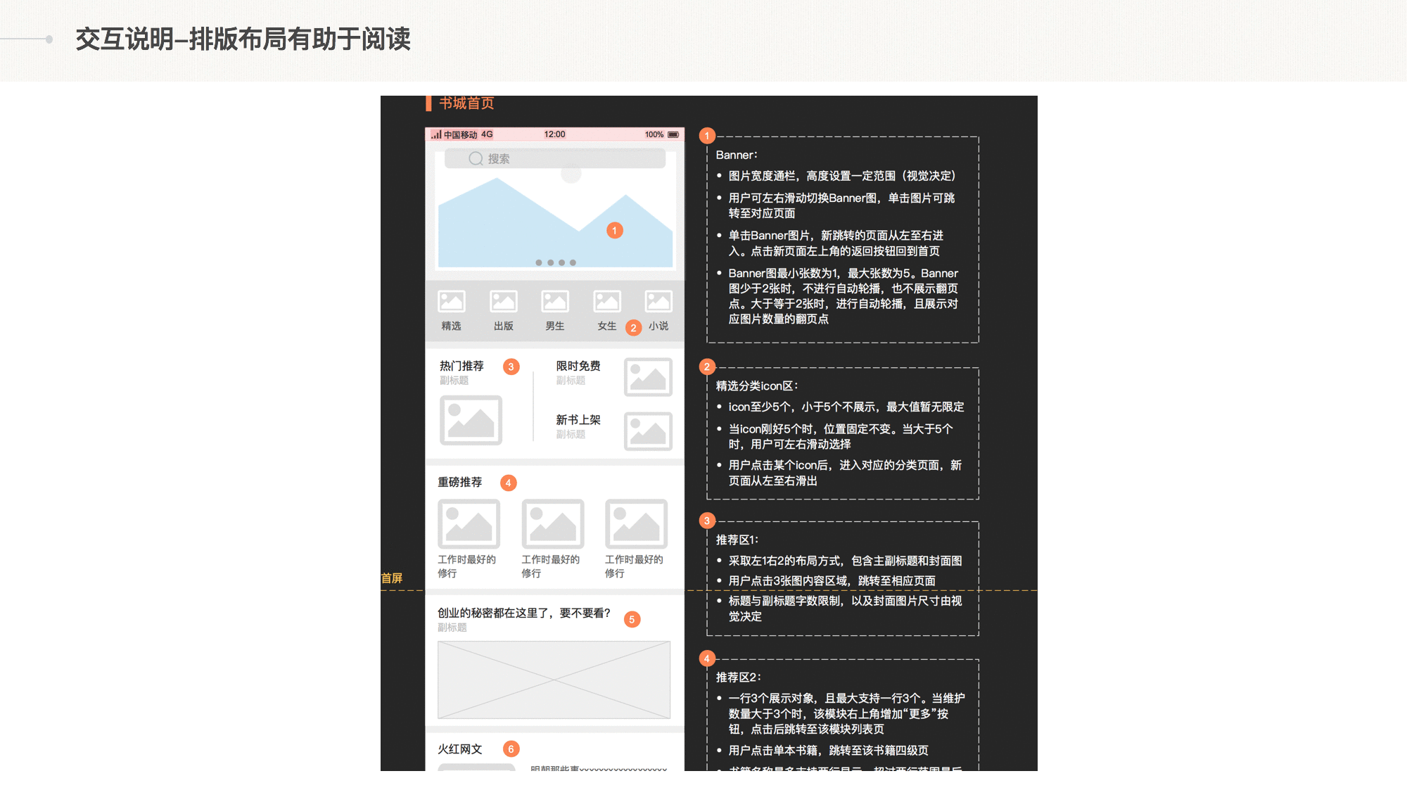 比如:原型图内容元素标上数字放置在上方,对应的交互说明放置在原型图下方;或者原型图在左侧,交互说明在右侧,有的设计师也会把元素和对应的交互说明用连接线连起来。